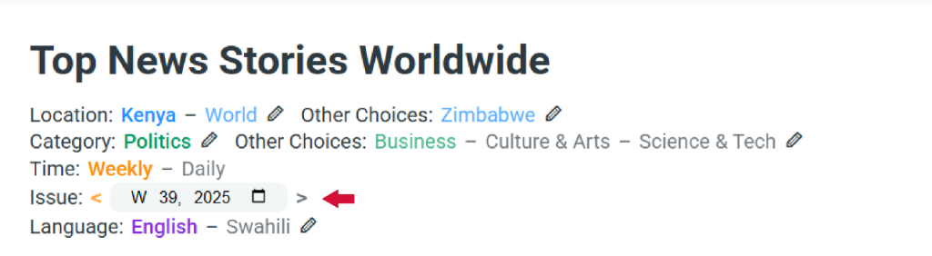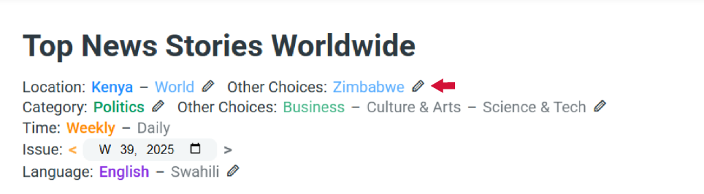 To filter news, check the options above the feed. Click the pencil icon next to any filter to open the Preferences page, where you can update your location, categories, time, or language.