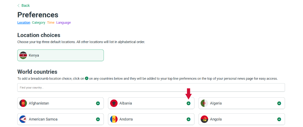 For Location, click the plus icon next to a country or use the search bar to find it.